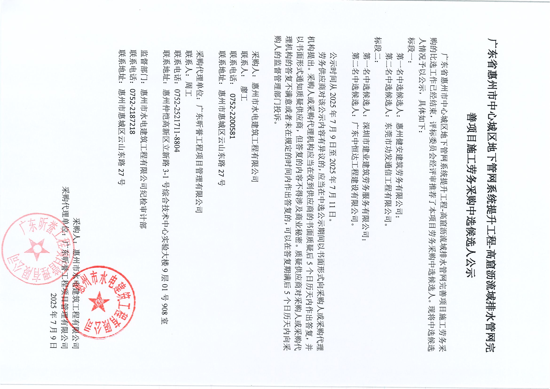 廣東省惠州市中心城區(qū)地下管網(wǎng)系統(tǒng)提升工程-高窟瀝流域排水管網(wǎng)完善項目施工勞務采購中選候選人公示