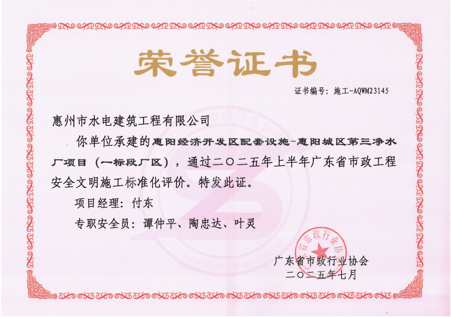 近日,廣東省市政行業(yè)協(xié)會傳來喜訊,由我司承建的惠陽經(jīng)濟(jì)開發(fā)區(qū)配套設(shè)施—惠陽城區(qū)第三凈水廠項目(一標(biāo)段廠區(qū)),順利通過2025年上半年“廣東省市政工程安全文明施工標(biāo)準(zhǔn)化”評價。這一榮譽(yù)不僅是對我司項目管理與施工水平的高度肯定,更是對我司始終堅持高標(biāo)準(zhǔn)、嚴(yán)要求推進(jìn)安全文明施工的生動詮釋,為行業(yè)樹立了可借鑒、可推廣的標(biāo)桿典范。