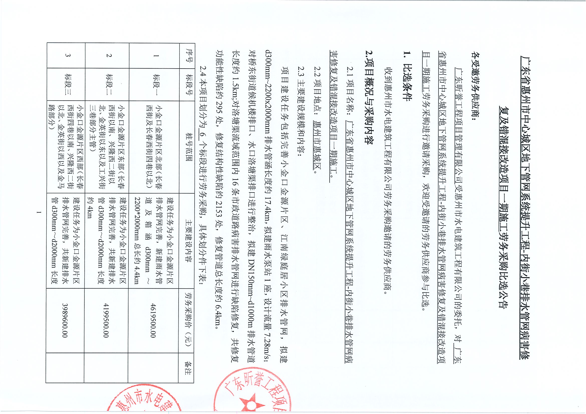廣東省惠州市中心城區(qū)地下管網(wǎng)系統(tǒng)提升工程-內(nèi)街小巷排水管網(wǎng)病害修復(fù)及錯(cuò)混接改造項(xiàng)目一期施工勞務(wù)采購(gòu)比選公告