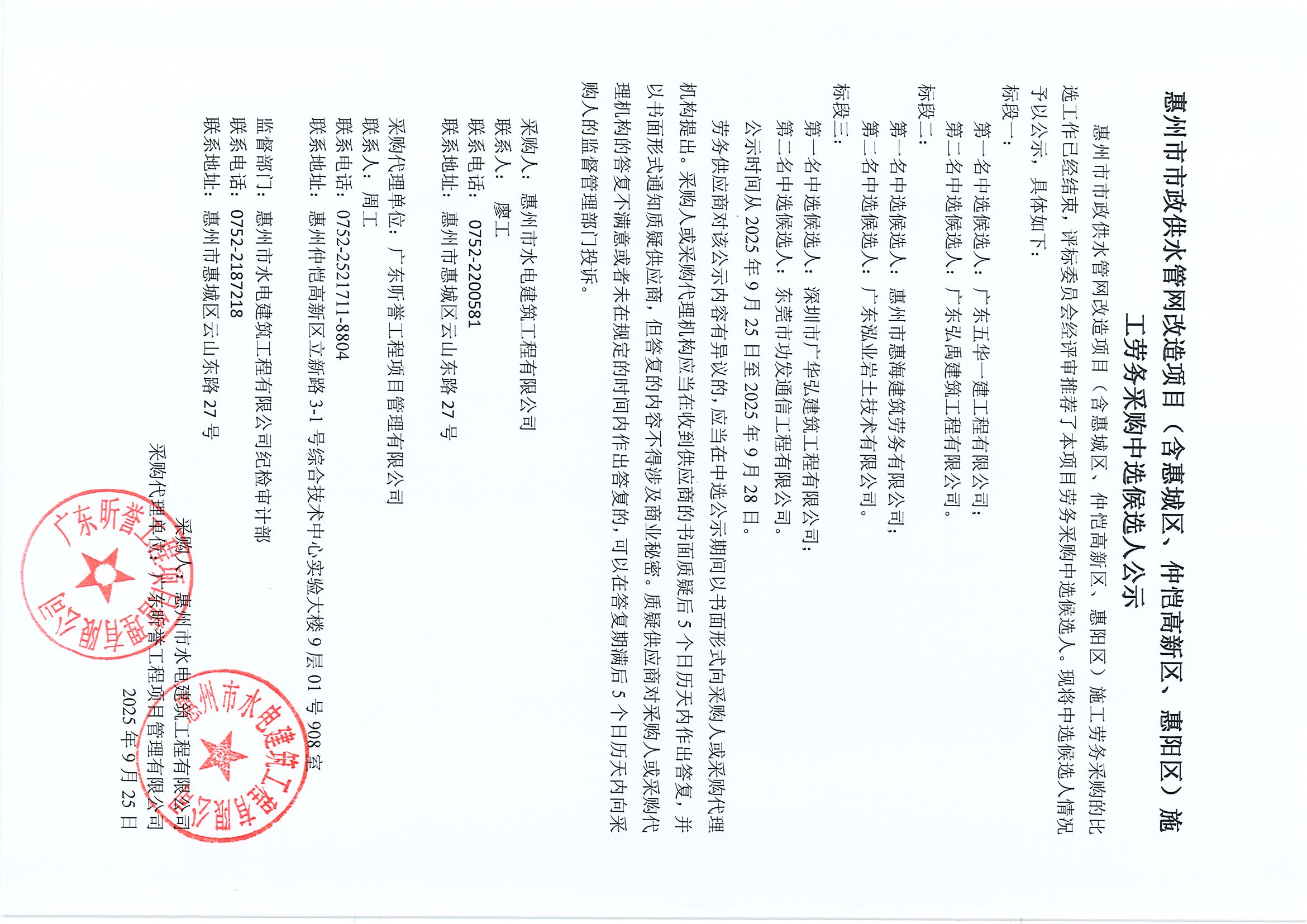 惠州市市政供水管網(wǎng)改造項(xiàng)目(含惠城區(qū)、仲愷高新區(qū)、惠陽區(qū))施工勞務(wù)采購中選候選人公示