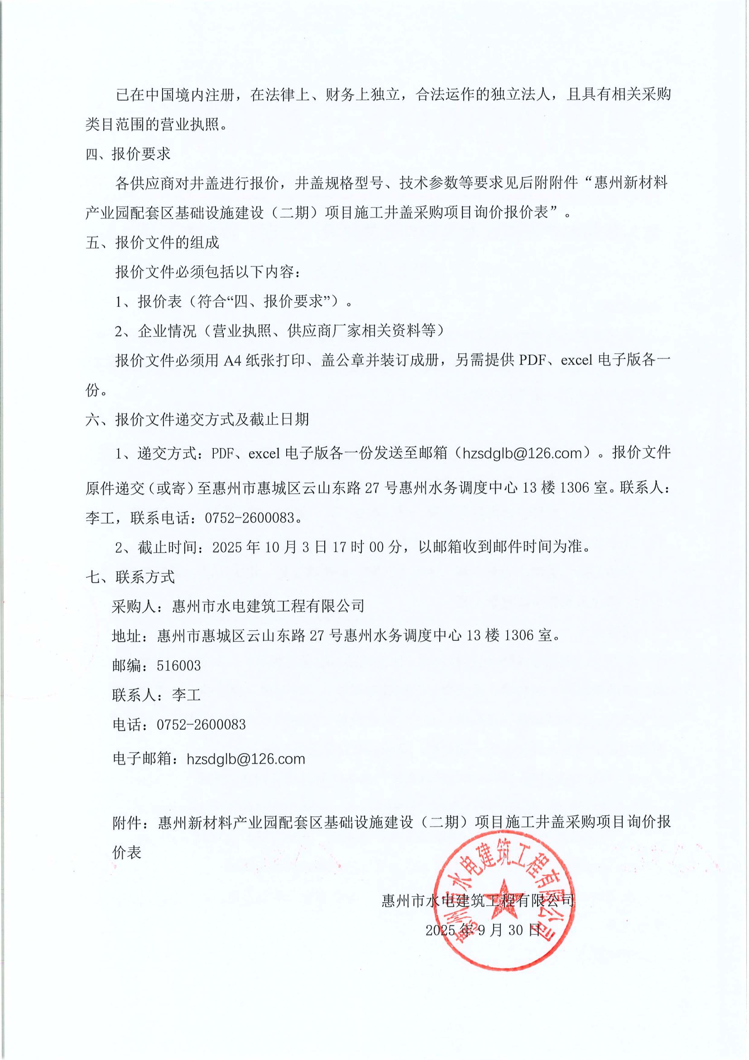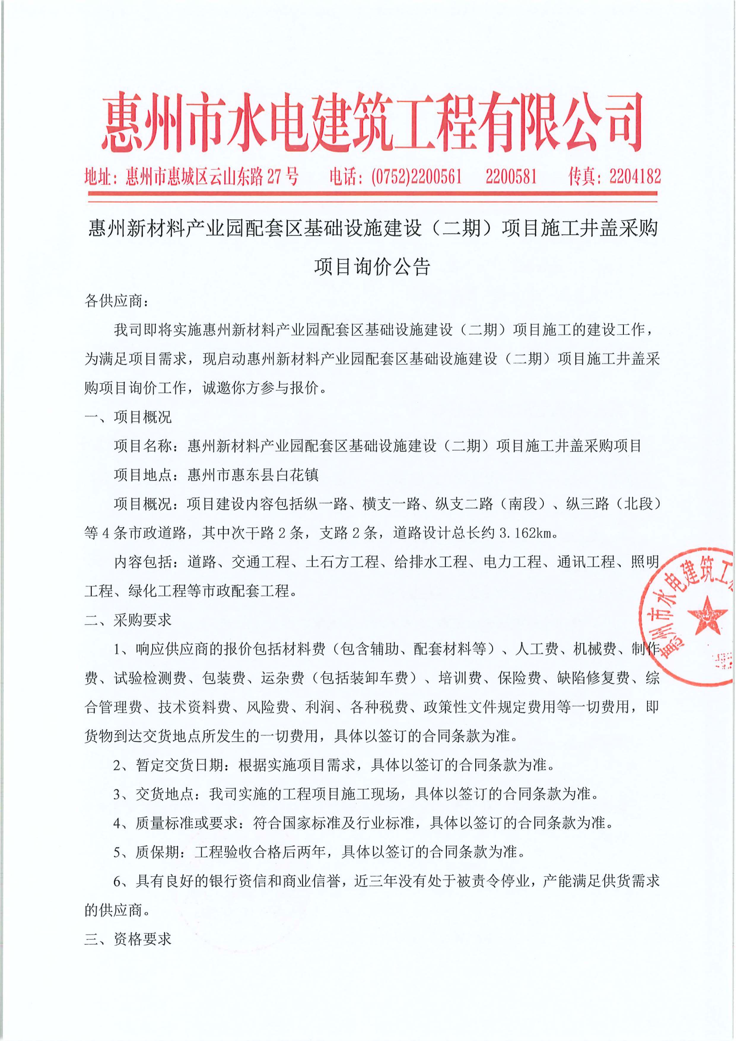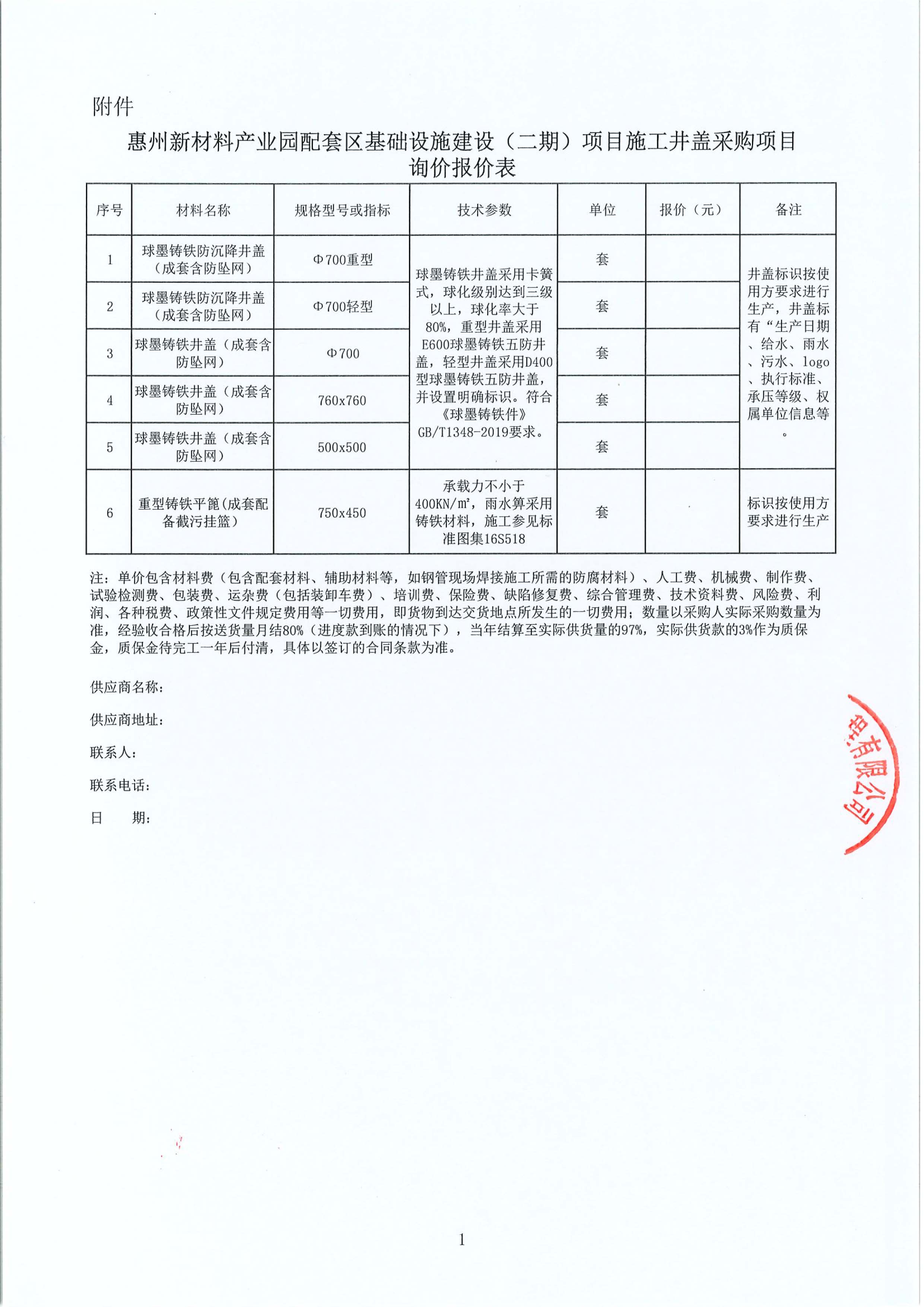 惠州新材料產(chǎn)業(yè)園配套區(qū)基礎(chǔ)設(shè)施建設(shè)(二期)項目施工井蓋采購項目詢價公告附件: