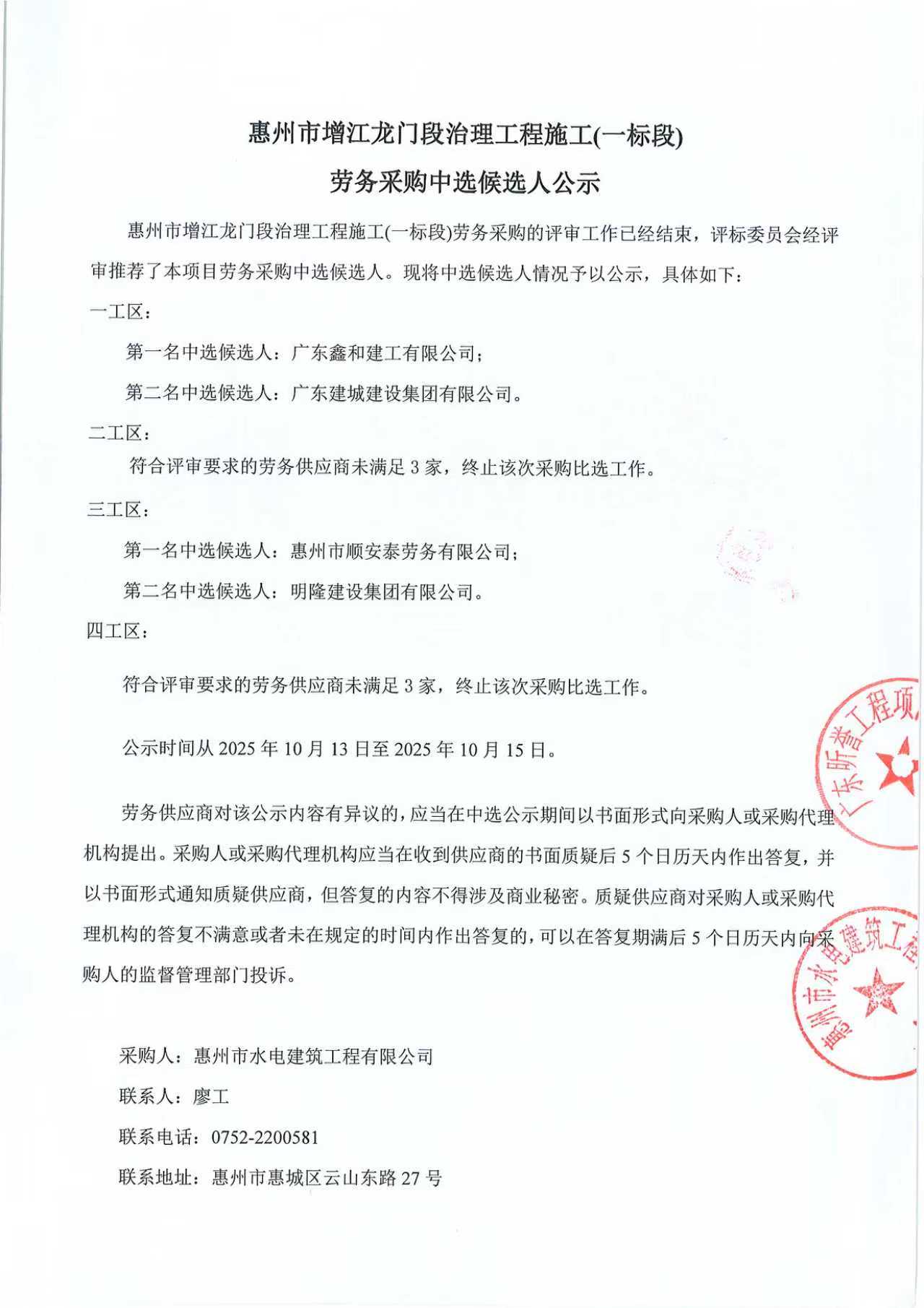 惠州市增江龍門段治理工程施工(一標段)勞務采購中選候選人公示