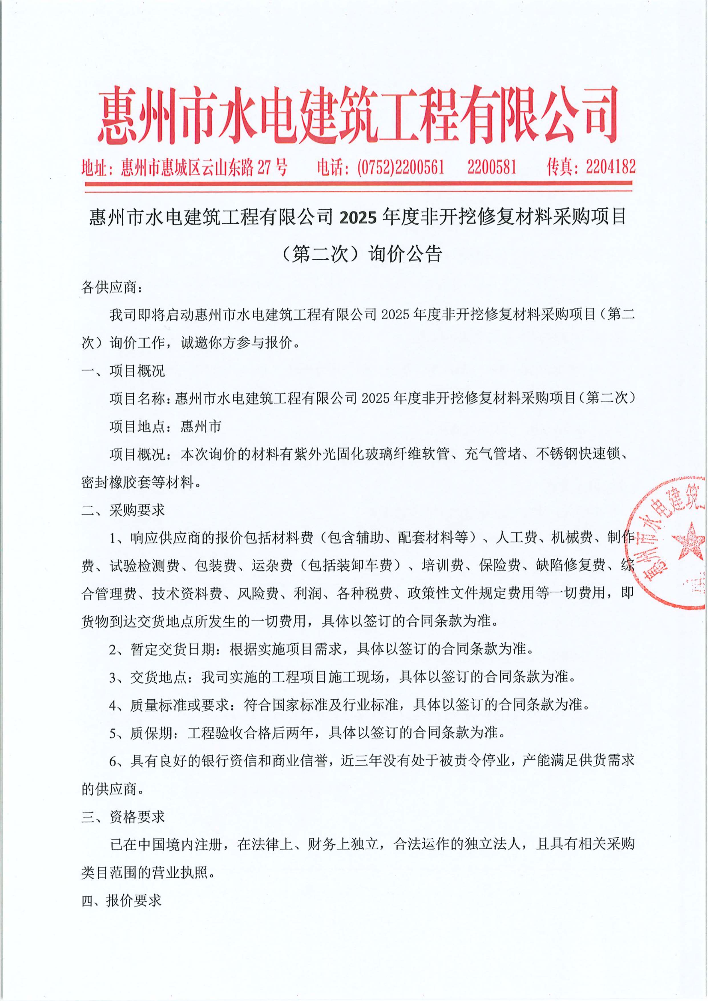 惠州市水電建筑工程有限公司2025年度非開挖修復(fù)材料采購項目(第二次)詢價公告附件: