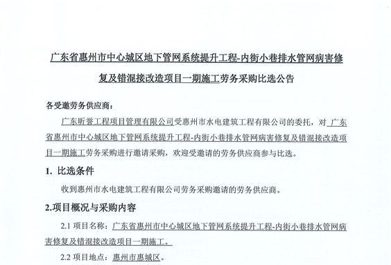 廣東省惠州市中心城區(qū)地下管網(wǎng)系統(tǒng)提升工程-內(nèi)街小巷排水管網(wǎng)病害修復(fù)及錯(cuò)混接改造項(xiàng)目一期施工勞務(wù)采購(gòu)(第二次)比選公告......