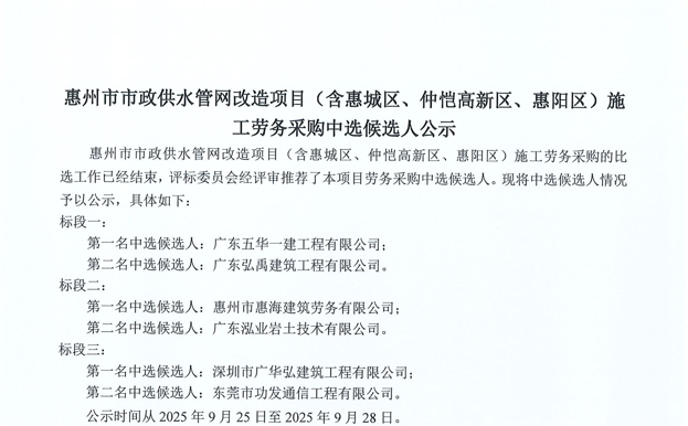 惠州市市政供水管網(wǎng)改造項(xiàng)目(含惠城區(qū)、仲愷高新區(qū)、惠陽(yáng)區(qū))施工勞務(wù)采購(gòu)中選候選人公示......