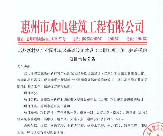 惠州新材料產(chǎn)業(yè)園配套區(qū)基礎(chǔ)設(shè)施建設(shè)(二期)項(xiàng)目施工井蓋采購(gòu)項(xiàng)目詢價(jià)公告......