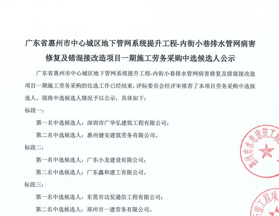 廣東省惠州市中心城區(qū)地下管網(wǎng)系統(tǒng)提升工程-內(nèi)街小巷排水管網(wǎng)病害修復(fù)及錯(cuò)混接改造項(xiàng)目一期施工勞務(wù)采購(gòu)(第二次)中選候選人公示......