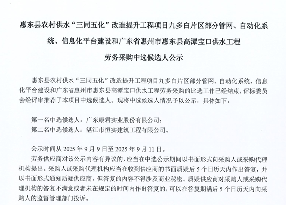 惠東縣農(nóng)村供水“三同五化”改造提升工程項(xiàng)目九多白片區(qū)部分管網(wǎng)、自動化系統(tǒng)、信息化平臺建設(shè)和廣東省惠州市惠東縣高潭寶口供水工程勞務(wù)采購中選候選人公示......