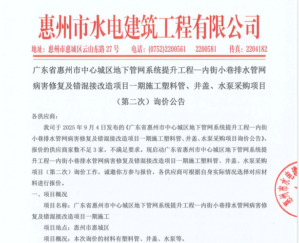 廣東省惠州市中心城區(qū)地下管網(wǎng)系統(tǒng)提升工程—內(nèi)街小巷排水管網(wǎng)病害修復(fù)及錯(cuò)混接改造項(xiàng)目一期施工塑料管、井蓋、水泵采購項(xiàng)目(第二次)詢價(jià)公告......