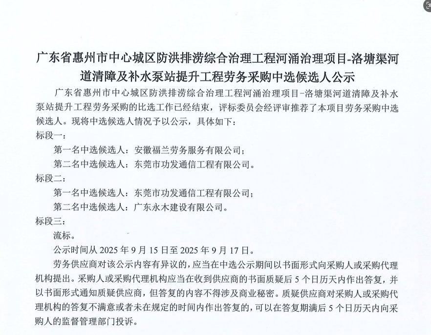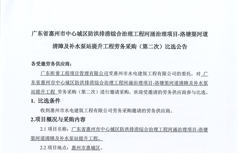 廣東省惠州市中心城區(qū)防洪排澇綜合治理工程河涌治理項(xiàng)目-洛塘渠河道清障及補(bǔ)水泵站提升工程勞務(wù)采購比選公告......
