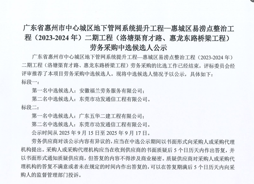 廣東省惠州市中心城區(qū)地下管網(wǎng)系統(tǒng)提升工程—惠城區(qū)易澇點(diǎn)整治工程(2023-2024年)二期工程(洛塘渠育才路、惠龍東路橋梁工程)勞務(wù)采購中選候選人公示......