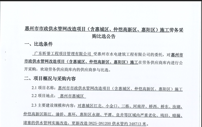 惠州市市政供水管網(wǎng)改造項(xiàng)目(含惠城區(qū)、仲愷高新區(qū)、惠陽區(qū))施工勞務(wù)采購比選公告......